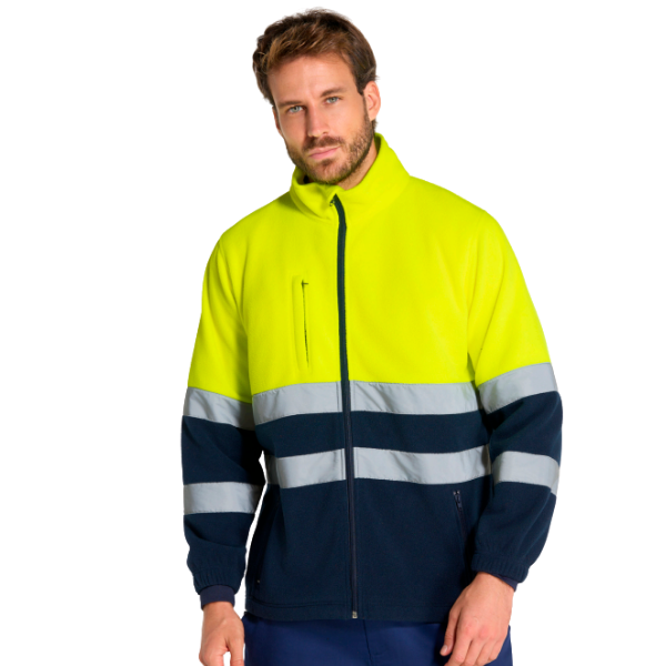 Chaqueta polar de alta visibilidad con cintas reflectantes y bolsillos con cremallera. Ideal para trabajos en exteriores.