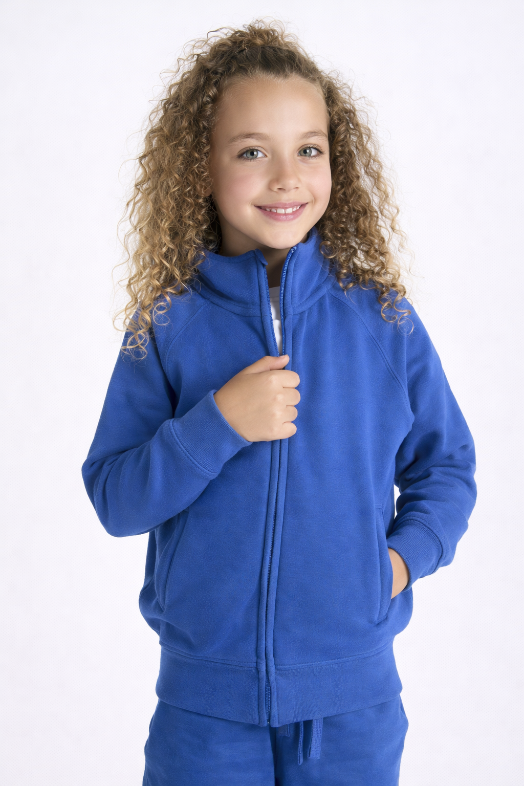 La Kid Full Zip Sweatshirt es una sudadera unisex para niño con cremallera entera y cuello alto, diseñada para ofrecer comodidad, abrigo y practicidad en el uso diario. Al no llevar capucha, es una opción muy demandada para colegios, actividades deportivas, excursiones y uniformes infantiles.